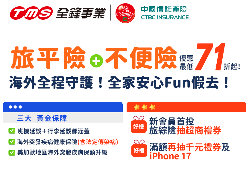 - 凡經由本通路完成投保者,適用參加中國信託產險官網投保抽獎活動,完成線上投保任一險種 (限每單筆保費滿500元(含)以上),獎項為超商禮券1,000元共5名、iPhone 17 256GB 共1名,其活動請詳見中國信託產險官網。