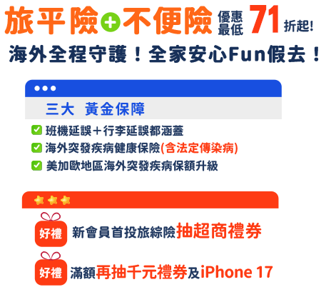 於中國信託產險網路投保專區完成線上投保旅綜險(限每單筆保費滿500元(含)以上),抽超商禮券1,000元共5名、iPhone 17 256GB 共1名